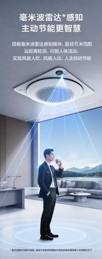 不仅如此,小蓝翼天花机可以选配毫米波雷达感知模块,通过远距离检测识别人体活动,实时感知室内人体存在。当空间无人时,设备能自动降低运行功率并切换至节能模式,实现主动省电。