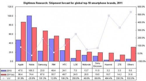 Digitimes Research分析师卢克·林(Luke Lin)在报告中写道:“苹果2011年智能手机出货量有望超越诺基亚,成为全球最大智能手机厂商,华为的智能手机出货量将保持稳步增长,缩小它与索尼爱立信和摩托罗拉之间的差距。