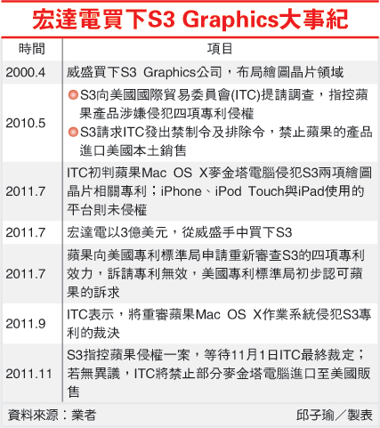 苹果和宏达电以ITC作为战场,专利战从去年开打;去年3月苹果向ITC提告,认为宏达电侵犯其十项专利,威盛去年5月即以S3专利反诉,反咬苹果一口。