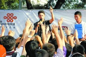 只见这男子拿出一款手机,外表看很像iPone4。他大声重复着喊话,“手机可以同时用移动和联通的手机卡,手机是免费赠送的!”每当“赠送”出口,便立刻引来台下一阵雀跃。